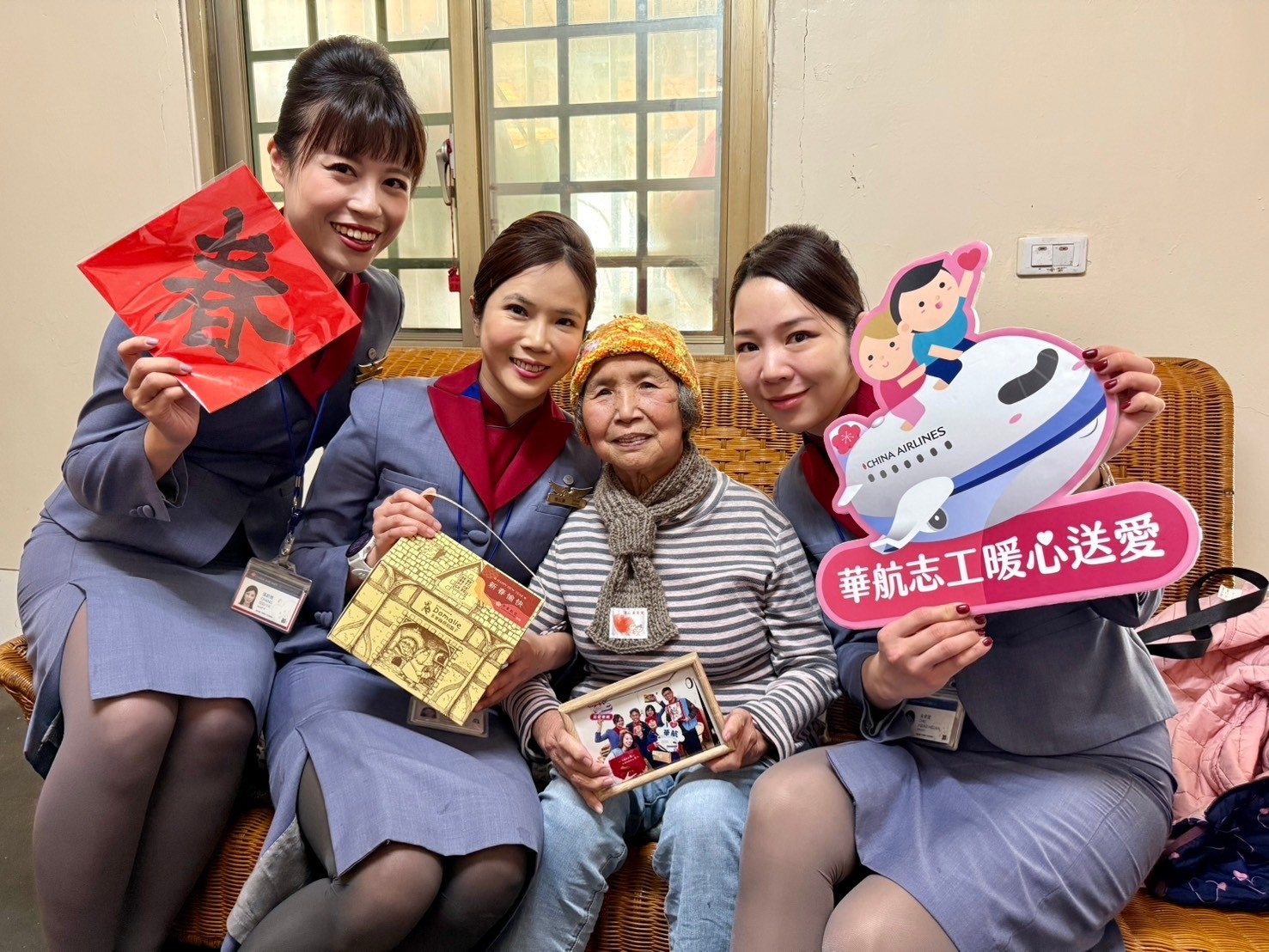 年節關懷禮內容包括年菜、元宵湯圓、沙其馬禮盒,以及義工親手編織、可禦寒的手套與毛帽;當華航和華山基金會志工帶著年節關懷禮登門拜訪,長輩們各個展開笑顏,緊握志工雙手,促膝聊起生活近況,幾句簡單的問候,卻在他們心中留下這個冬天最暖心的印象。