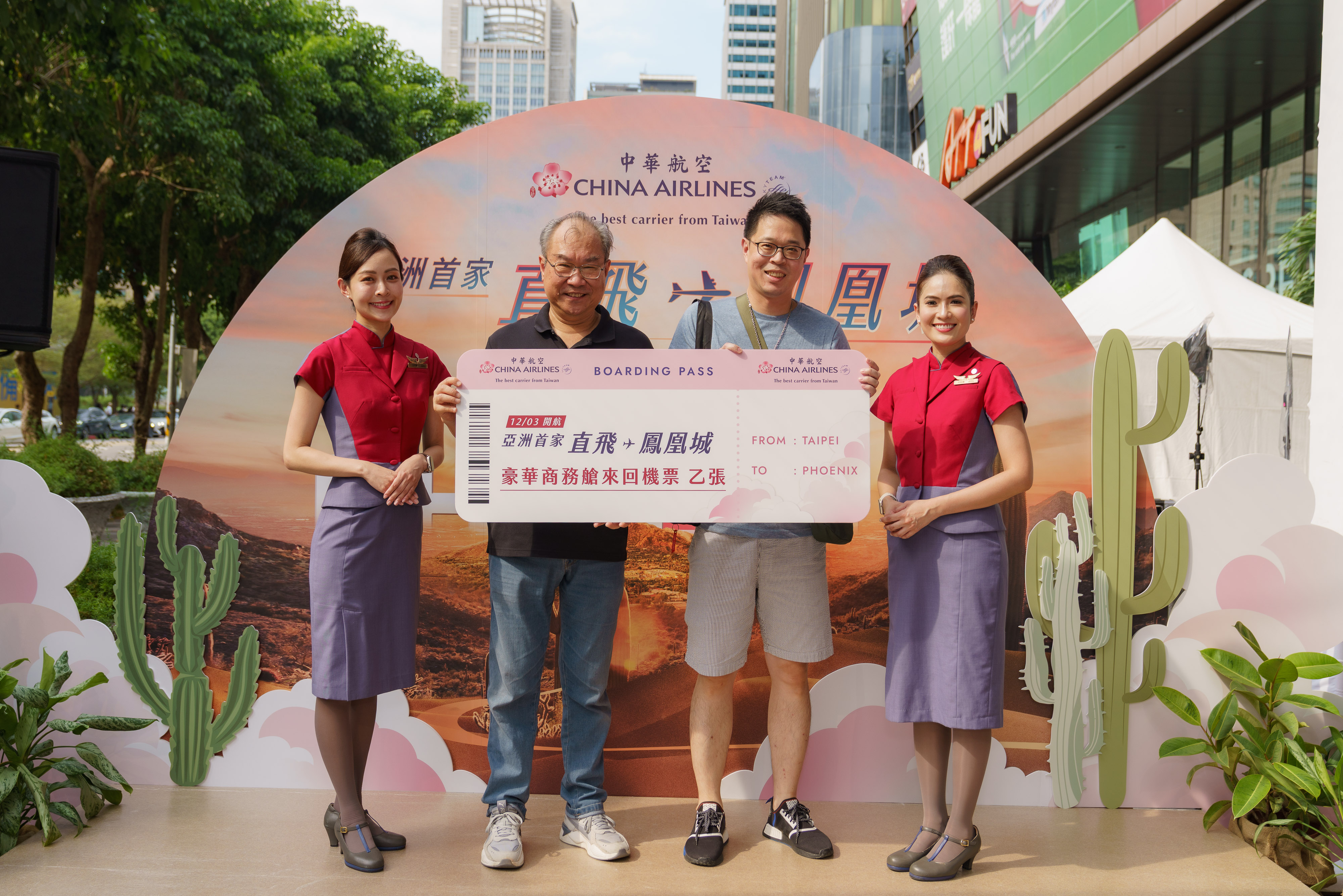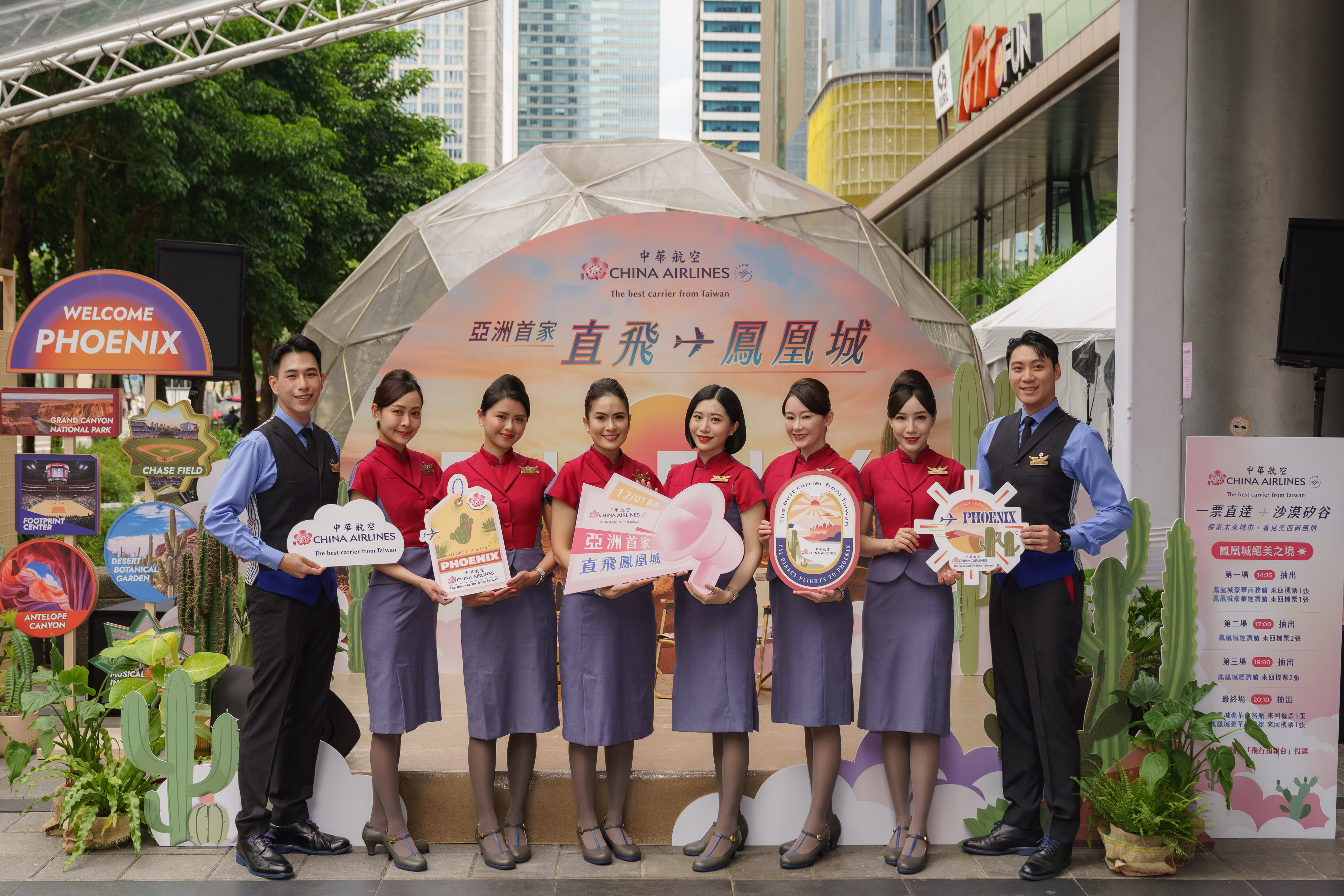 发布: 2025年 九月 20日中華航空直飛鳳凰城即將啟程,今(20)日將太陽之城著名的沙漠、仙人掌搬進台北信義區 ATT 4 FUN,打造熱情魅力的沉浸體驗,現場特別安排藝人演唱及氣球達人表演,還有眾人期待的機票抽獎環節,無論大人、小孩都從心搶先出發鳳凰城,享受異國風情的週末午後。