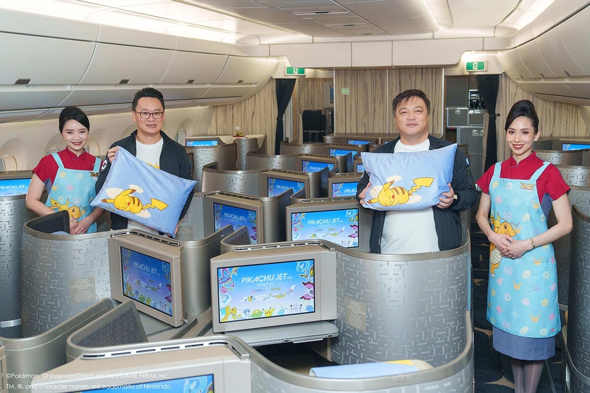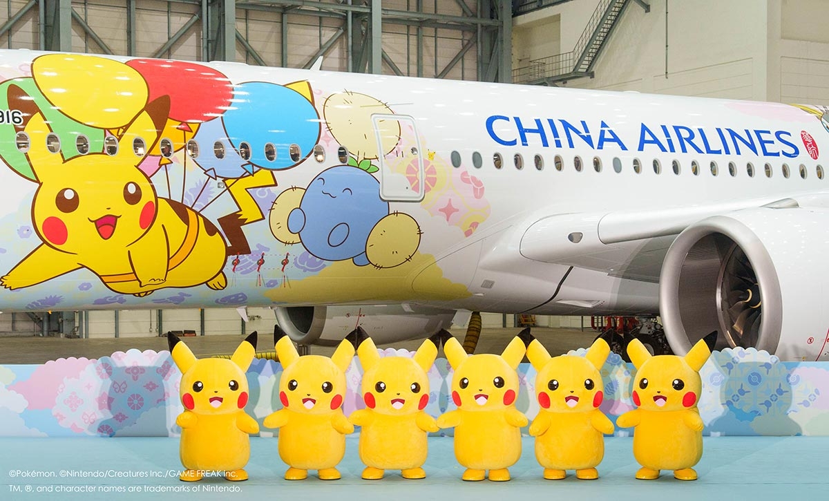 13 Pokémon are featured on the China Airlines Pikachu Jet CI2 including the Flying Pikachu, Clefairy, Dratini, Dragonair, Dragonite, Hoppip, Skiploom, Jumpluff, Beautifly, Swablu, Altaria, Cresselia, and Vivillon. Travelers with a keen eye may also spot a hidden surprise on the aircraft's engines. Inside the cabin, the Pokémon and Taiwanese floral tile motifs are elegantly applied to onboard amenities including the dining tray mat, mixed snack, themed paper cups, paper napkins, head rest covers, pillow cases and flight attendant aprons. To create an even more engaging atmosphere, China Airlines has introduced unique onboard souvenirs, such as Pikachu ballpoint pens and sticky notes.