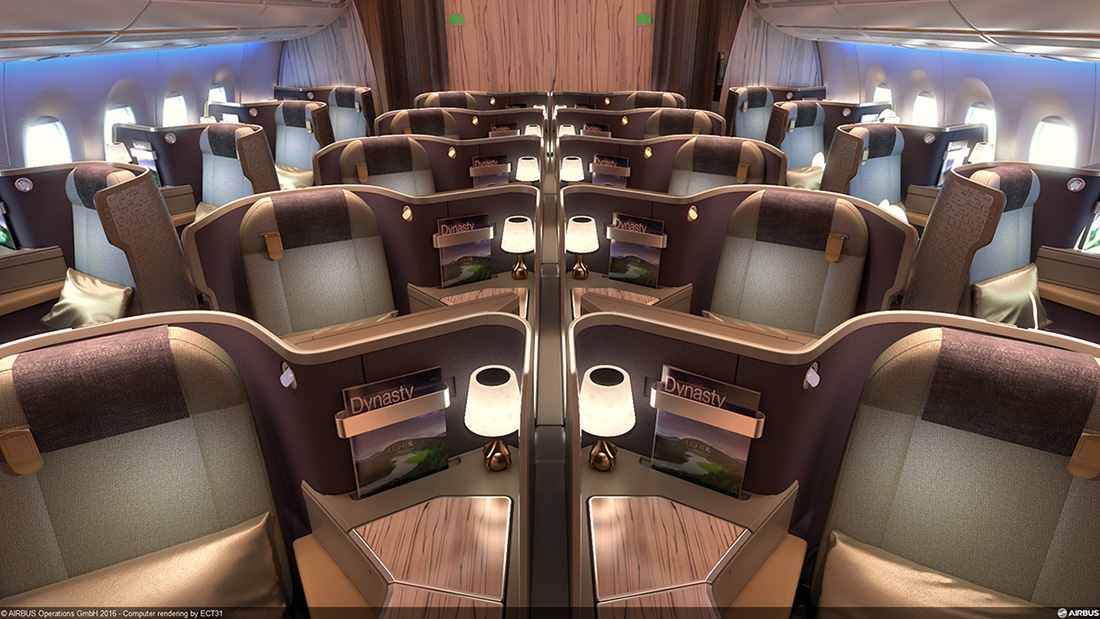 中華航空2016年領先國內業界引進最新型空中巴士A350-900XWB新世代中長程客機,以「最科技、最環保、最節能、最寬敞、最安靜」著稱。新機跳脫以往暗色為主的傳統客艙設計,加入年輕創新發想,金屬光感的異材質拼接為客艙增添時尚現代感。客艙挑高遼闊視野,打造獨立私人空間,配備符合人體工學的智慧座椅,輕易就可進入深層睡眠,提供量身訂做的舒適飛行,別出心裁的設計成功贏得全球旅客讚賞。