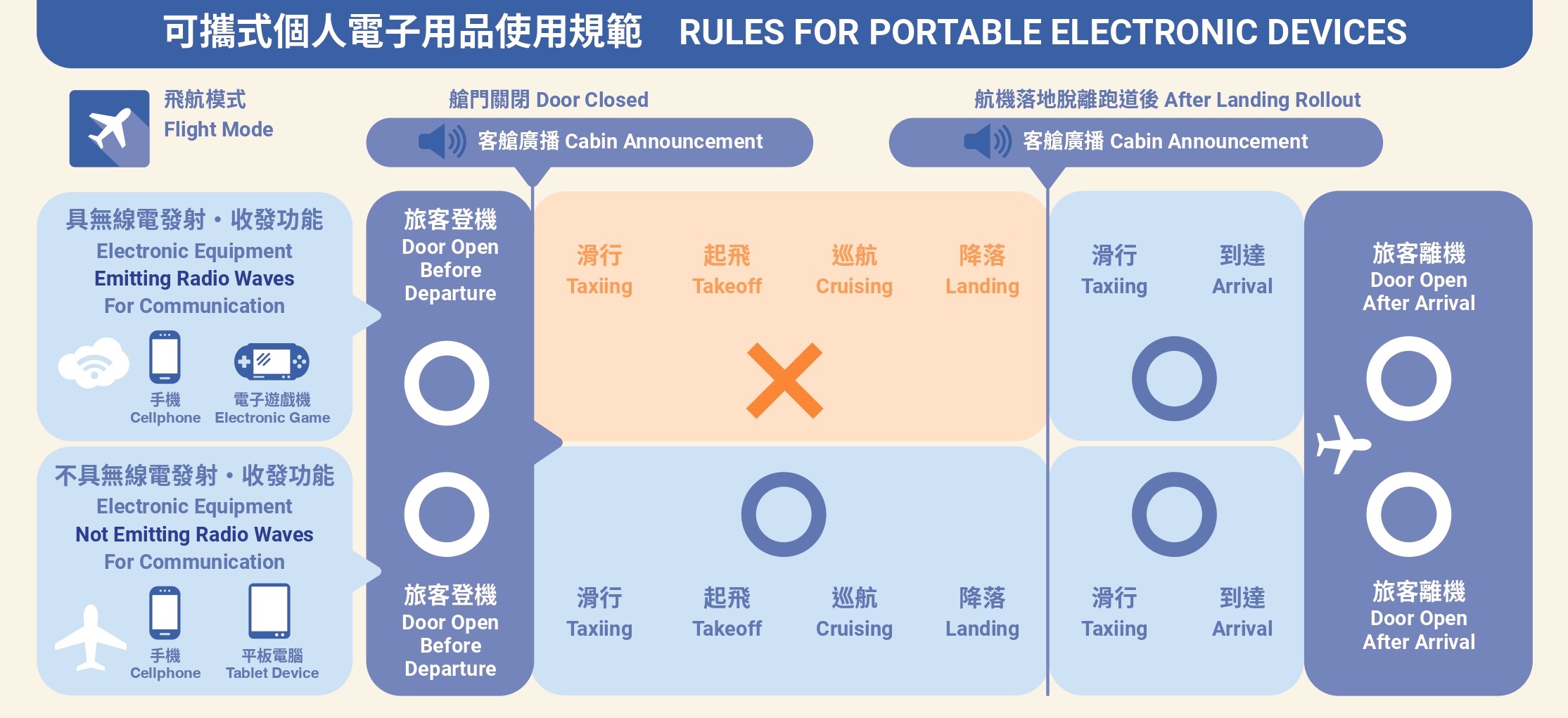 - After cabin doors are closed, passengers should follow the broadcast instructions to set personal electronic devices including mobile phones, tablet PCs, and laptops to flight mode with Wi-Fi turned off. After the aircraft has landed and cleared the runway, crew members will notify passengers via broadcast of a time when devices can be used.