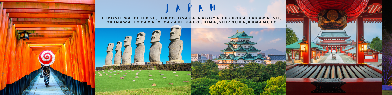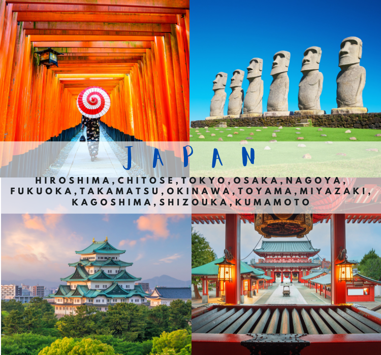 14 kota Jepang antara lainnya Hiroshima, Chitose, Tokyo, Osaka, Nagoya, Fukuoka, Takamatsu, Okinawa, Toyama, Miyazaki, Kagoshima, Shizouka, dan Kumamoto.