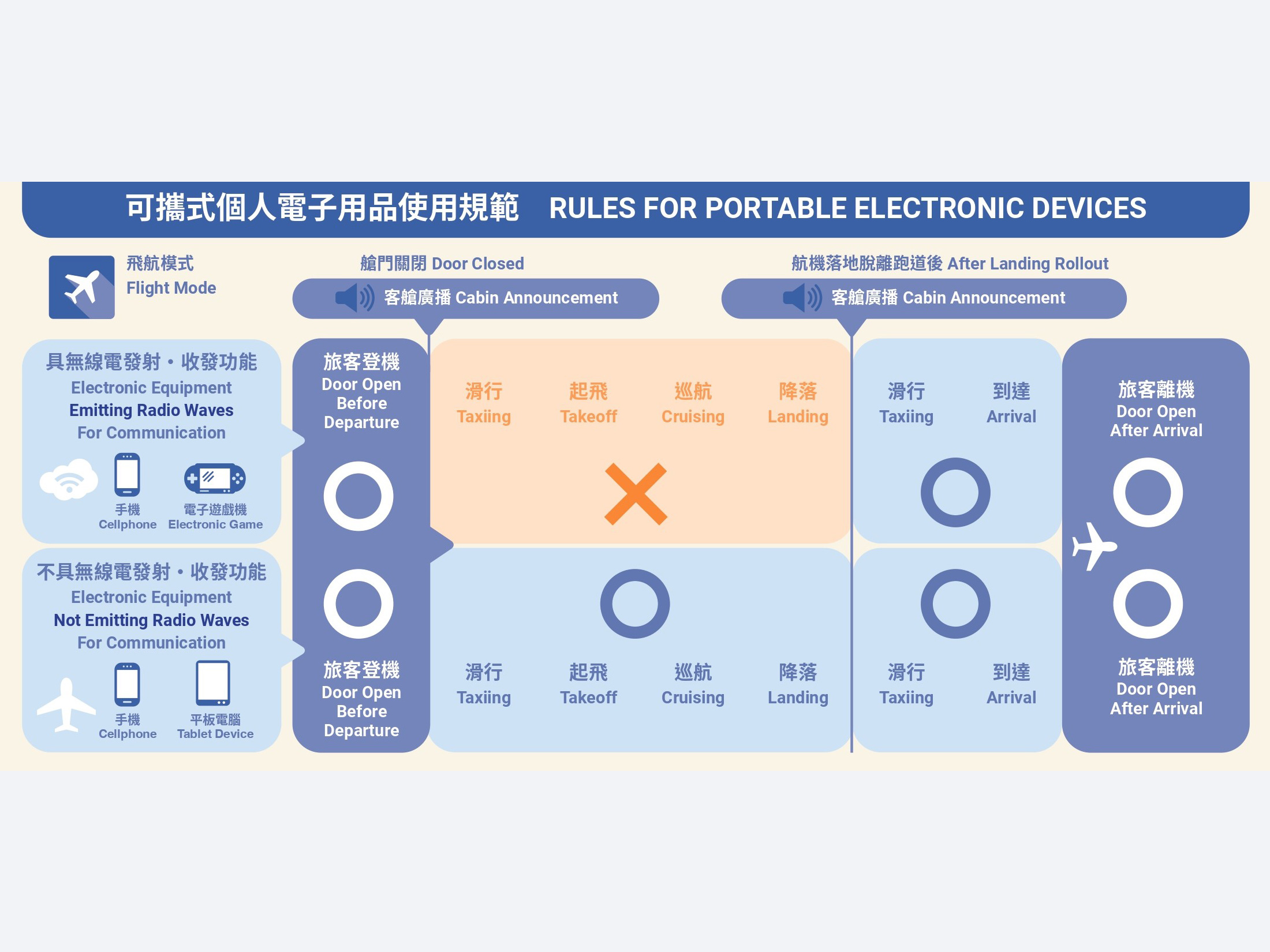 Selepas pintu kabin ditutup, penumpang hendaklah mengikut arahan yang disiarkan untuk menetapkan peranti elektronik peribadi termasuk telefon bimbit, komputer tablet peribadi dan komputer riba kepada mod penerbangan dengan Wi-Fi dimatikan. Selepas pesawat mendarat dan mengosongkan landasan, kru kabin akan memaklumkan penumpang melalui siaran tentang waktu apabila peranti boleh digunakan.