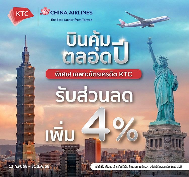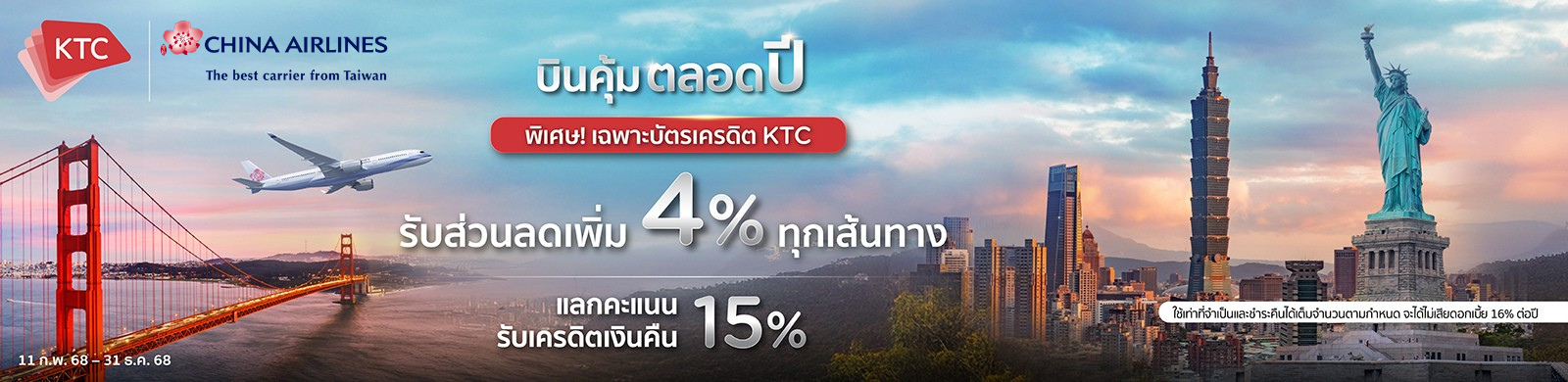 - ออกบัตรโดยสารผ่าน หน้าโปรโมชั่นบัตรเครดิต KTC บนเว็บไซต์ ไชน่าแอร์ไลน์ ตั้งแต่วันที่ 11 กุมภาพันธ์ – 31 ธันวาคม 2568