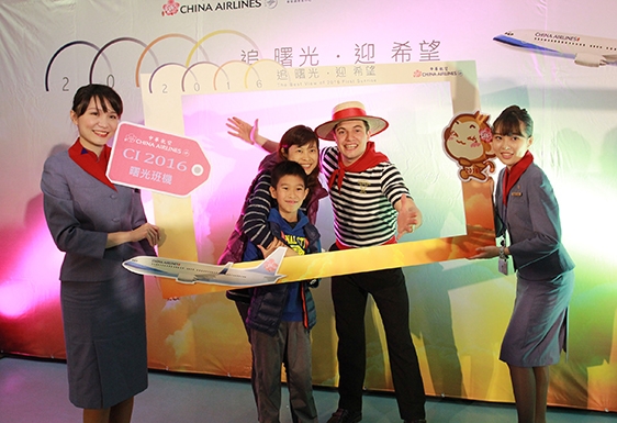 華航 CI2016 桃園—香港航班於1月1日清晨 05:20 從桃園機場起飛,158 位幸運旅客中,有超過八旬的長者,也有年紀不到10歲的小朋友搭乘,闔家追曙光慶祝新年。曙光班機於 05 : 45 抵達宜蘭三萬英呎高空後,沿東部海岸線向南飛行,06 : 18 於花蓮海濱拔得頭籌欣賞全台最早、最高的日出,搶先全台平地迎接了猴年第一道曙光,旅客們紛紛驚豔曙光的燦爛;華航更邀請貢多拉船夫機上獻唱,旭日東昇的一刻,隱身在旅客當中的船夫們緩緩吟唱旋律,讓旅客無不驚喜。