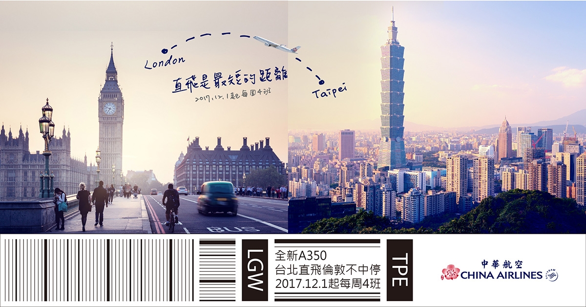 倫敦泰唔士河畔悠閒啜飲下午茶,登倫敦眼(London Eye)飽覽百萬夜景盡在眼前,造訪電影哈利波特場景國王十字車站九又四分之三月台,今年12月起,中華航空13小時直飛倫敦不中停!中華航空今(28)日宣布,於12月1日起開航台北-倫敦(蓋威克機場,Gatwick)航線,每周飛航4班,由最新A350機隊執飛,為台灣唯一直飛倫敦的航空公司。歡慶開航,推出台灣出發經濟艙來回機票未稅新台幣21,000元起,即日起於官網開賣。