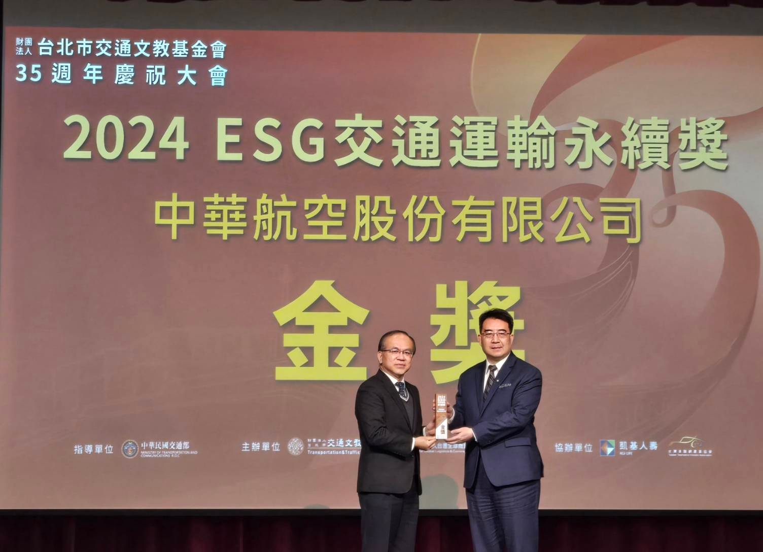 「ESG交通運輸永續獎」由交通部指導,財團法人台北市交通文教基金會與社團法人台灣全球商貿運籌發展協會共同主辦,本 (12) 月 28 日舉行頒獎典禮,由交通部政務次長陳彥伯頒發金獎予華航永續長鍾人傑。華航以率先同業成立企業永續委員會,連結董事會監管的ESG永續治理、環境/能源系統性風險管理架構、推動完善ISO作業系統並經第三方認證等具體作為,引領台灣航空業推動 ESG 永續發展,從30餘家參選企業中獲選,成為業界標竿典範。