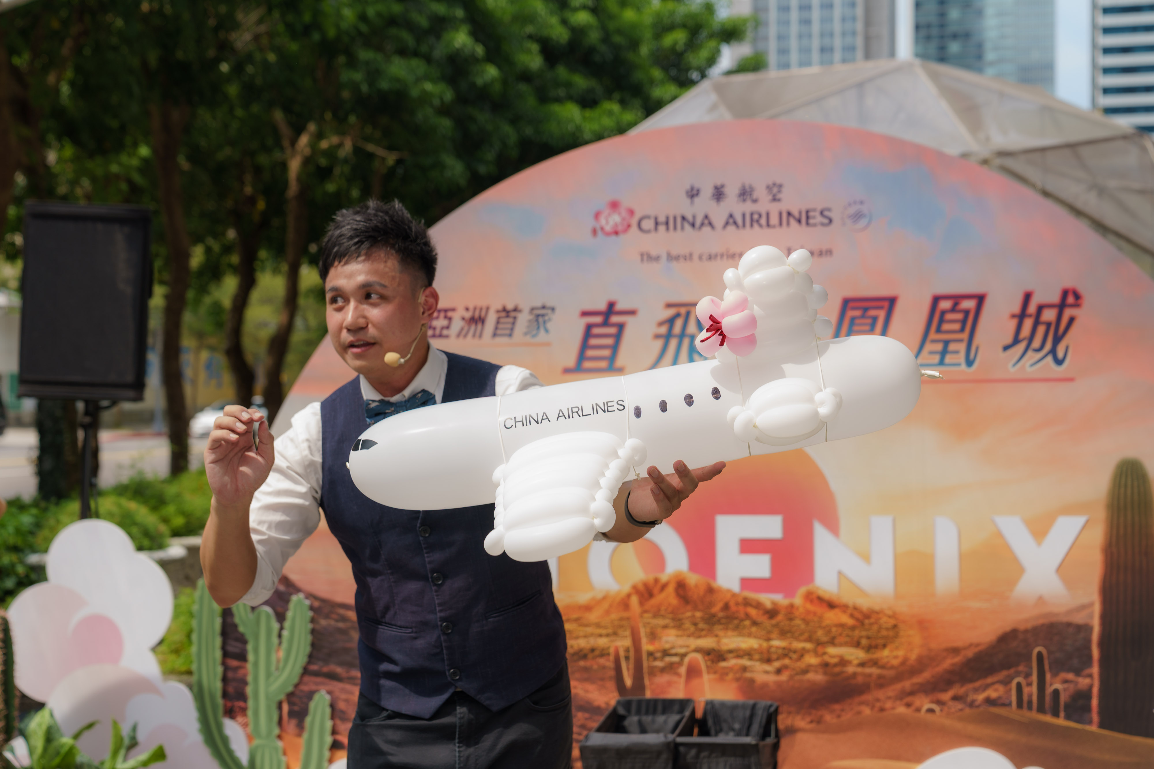 台北信義區 ATT 4 FUN 化身沙漠植物園,活動由靈魂女聲 9m88 一連帶來三首精彩歌曲揭開序幕,期間穿插氣球達人表演互動,創作出活靈活現的造型氣球,現場歡笑聲不斷,展區佈置充滿鳳凰城元素,讓民眾彷彿搭乘華航一秒抵達太陽之城,體驗充滿仙人掌的沙漠風情。